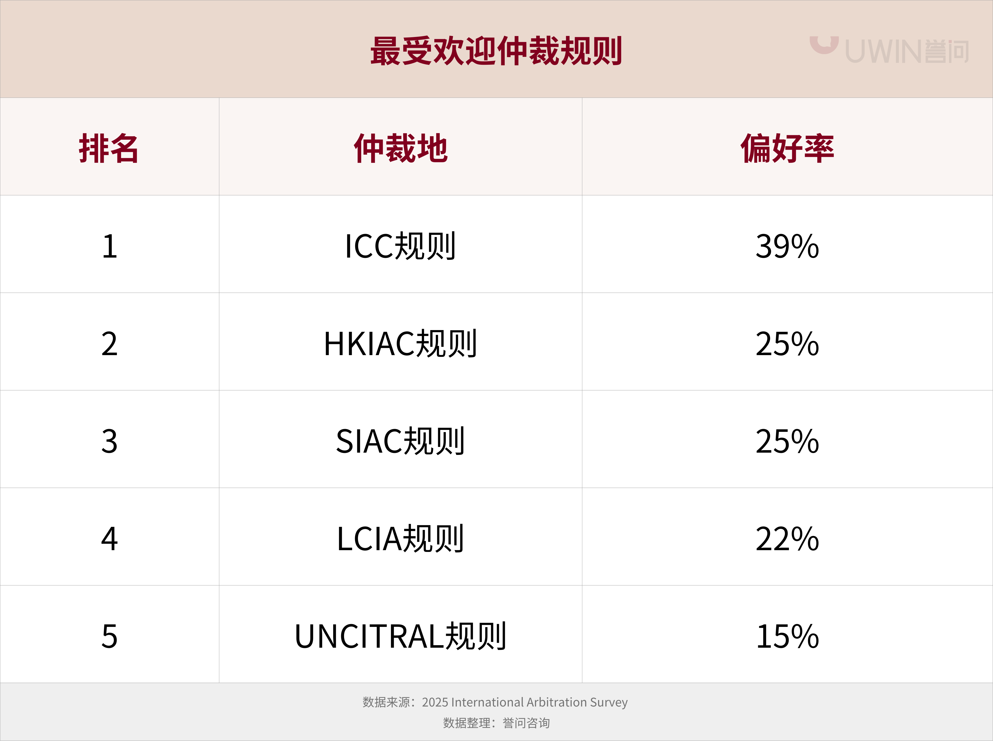 在仲裁规则的选择上,全球用户表现出明显的双重偏好趋势:一方面是对制度完备、执行稳定的大型仲裁机构规则(如ICC、LCIA)的持续信任;另一方面则是对具有地域优势和语言适配性的区域性机构规则(如HKIAC、SIAC)的快速倾斜。报告显示,国际商会(ICC)仲裁规则仍高居首位(39%),香港国际仲裁中心(HKIAC)与新加坡国际仲裁中心(SIAC)规则均获得25%的偏好比例。