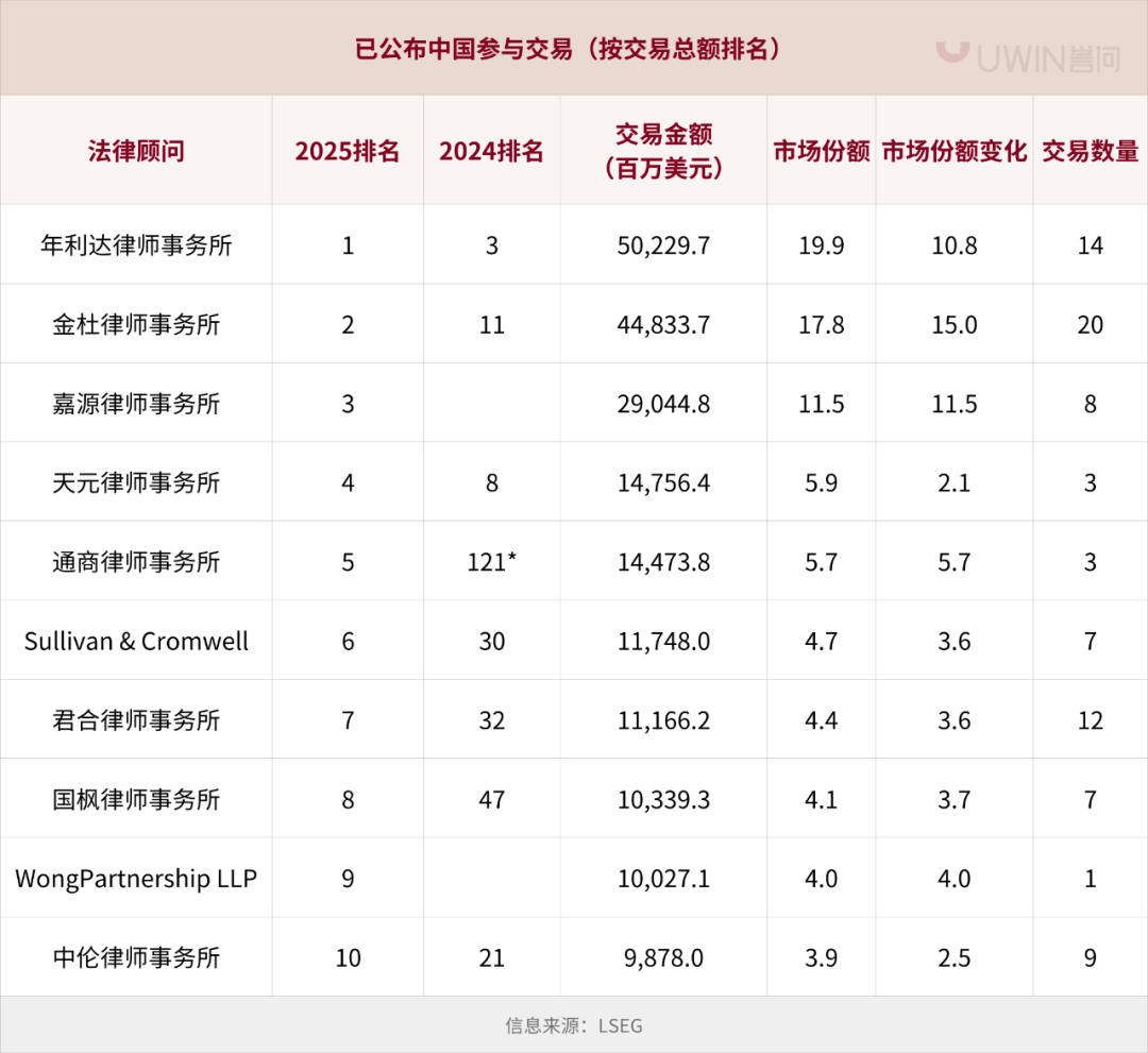在已公布涉及中国大陆地区参与的并购交易排行榜中,年利达、金杜、嘉源按交易金额排名前三,方达、金杜、年利达按交易数量排名前三。