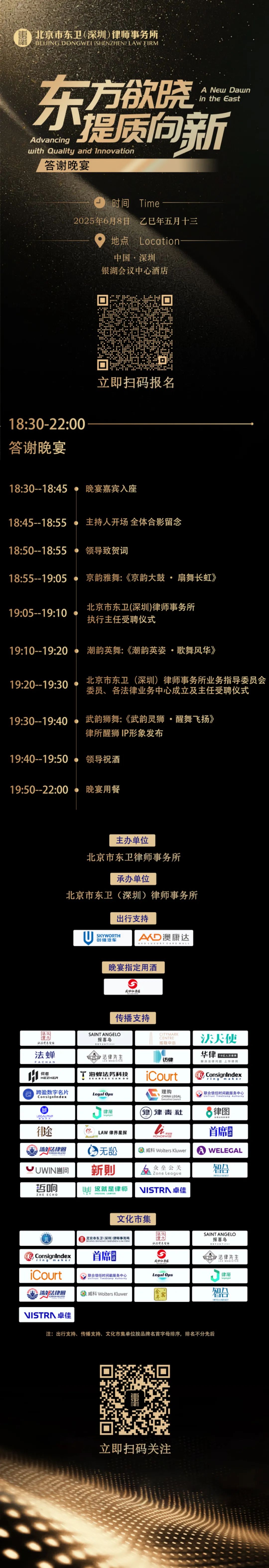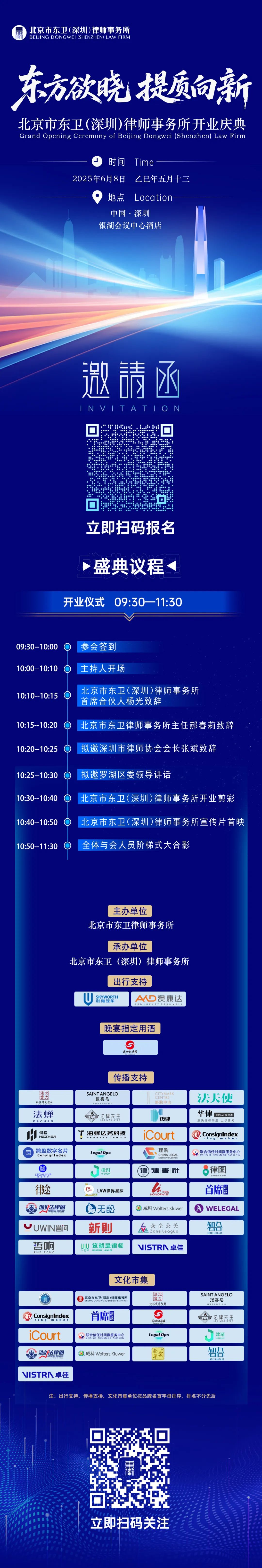 “东方欲晓,提质向新”,让我们在 2025 年 6 月 8 日相聚深圳,共赴北京市东卫(深圳)律师事务所开业庆典暨上市公司高质量发展高端论坛的盛会!