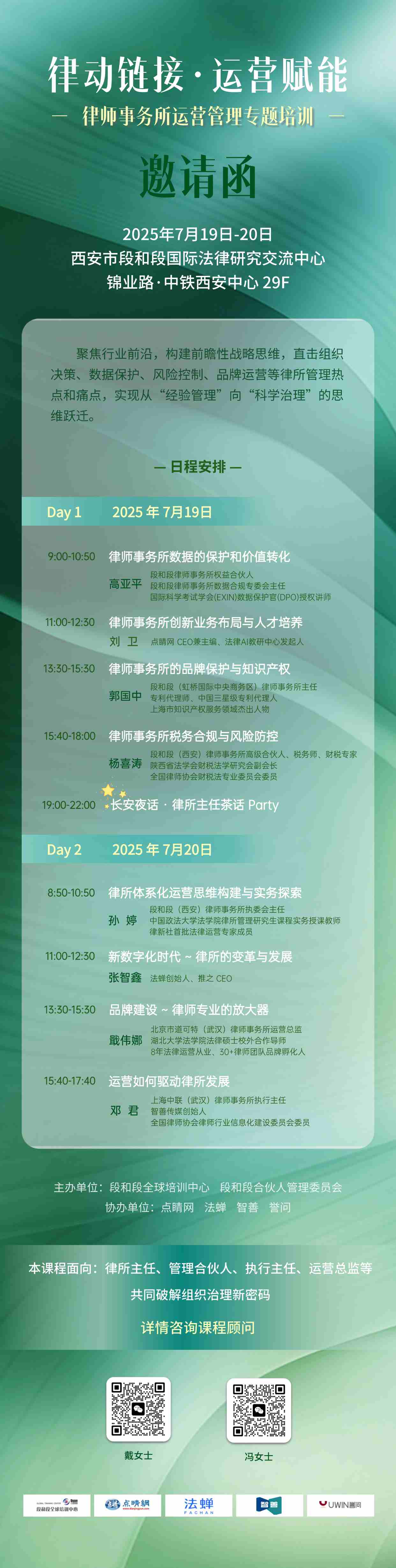 2025年7月19日-20日,段和段全球培训中心、合伙人管理委员会联合点睛网、法蝉、智善、誉问等业内知名机构,将在古都西安共同举办“律动链接·运营赋能 —— 律所运营管理专题培训”。诚邀广大律所管理者、运营人员共同参与交流探讨。